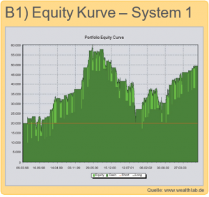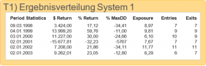 heftiger. Der Verlust des Jahres 2001 beträgt hier 63 Prozent, der Drawdown für dieses Jahr lag bei 86 Prozent. Aber auch hier gilt wieder: alle anderen Jahre schlossen mit Plus ab, wobei auch der zwischenzeitliche Verlust der Jahre 2000 (-54 Prozent) und 2002 (-47 Prozent) sicher noch um einiges zu hoch ist. 14 Prozent des Kapitals waren durchschnittlich gebunden. Aus Bild 2 lässt sich auch ablesen, dass das System insgesamt einen maximalen Drawdown von 92 Prozent erzeugte. Das Gesamtkapital fiel unter 10.000 Euro, also beinahe Totalverlust.