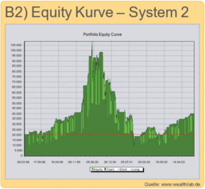 Nehmen wir aber mal an, ein Investor würde aber an diesem Punkt mit 10.000 Euro einsteigen, so würde sich sein Kapital bis September 2003 immerhin vervierfacht haben. Hier tritt der gleiche Erholungseffekt auf, wie der in System 1 beschriebene. Im System 2 entsteht durch den steigenden Kapitaleinsatz natürlich ein entsprechender Hebeleffekt.