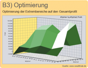 Wir haben zuerst die Grenzwerte der Extremzonen variiert. Es gilt zu überprüfen, ob dadurch die Drawdown-Phasen minimiert werden können. Dies könnte z.B. durch einen früheren Ausstieg, also Senkung des oberen Extremwerts auf unter 80 Punkte, und/oder durch Erhöhen der Einstiegsschwelle auf über 20 Punkte erreicht werden. Bild 3 zeigt die Ergebnisse der Testreihe zur Optimierung der Grenzwerte. Das System wurde hier auf den Gewinn als Zielfunktion optimiert. Wir variierten im Test den unteren Grenzwert von 20 bis 40, den oberen von 60 bis 80 Punkten. Als untere Grenze 40 Punkte war am aussichtsreichsten als obere Grenze 70 Punkte.