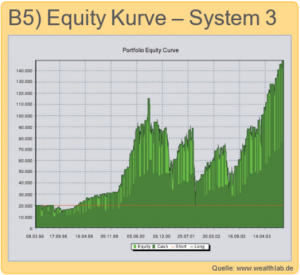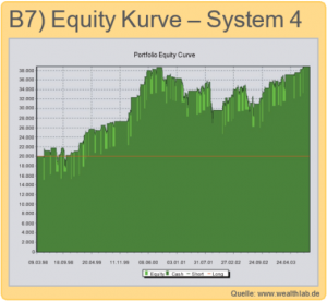 Average Profit: 1,19%, also vergleichbar den ersten Einstellungen; Payoff Ratio: 0,61, etwas schlechter als System 1 und 2; Profit Faktor: 1,86, besser als System 1und 2; Wealth-Lab Score: 51, also näher an System 1; Recovery Factor: 1,36, also einiges besser als die ersten beiden Systeme; Sharpe Ratio: 1, im guten Bereich und ebenfalls besser als die Einstellungen 1 und 2.