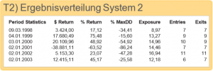 Der durchschnittliche Gewinn über alle Trades bleibt mit 1,13 Prozent gleich, ebenso das Payoff Ratio mit 0,78. Der Profit Faktor ergab sich zu 1,21, also schlechter als bei System 1. Der Wealth Lab Score lieferte mit einem Wert von 7,42 ein erheblich schlechteres Ergebnis als System 1. Dies zeigt, dass sich die Erhöhung des eingesetzten Kapitals nicht in einer adäquaten Profisteigerung niederschlägt. Der Recovery Faktor lag mit 0,2 ebenfalls schlechter als derjenige des Systems 1, zeigt also ein schlechteres Chance/Risikoprofil. Auch die Bestimmung des risikoadjustierten Gewinns (Sharpe Ratio) ergibt mit 0,49 einen schlechteren Wert.
