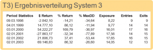 Es konnten aber bis zu 13 Gewinnpositionen hintereinander eröffnet werden, während maximal drei Verlusttrades in Folge erzeugt wurden. Dabei wurden aber durchschnittlich 15% des Kapitals gebunden. Trotz des hohen Gewinns zeigt sich das System immer noch viel zu volatil. Der maximale Drawdown lag bei 82%. Das Gesamtkapital schmolz von zirka