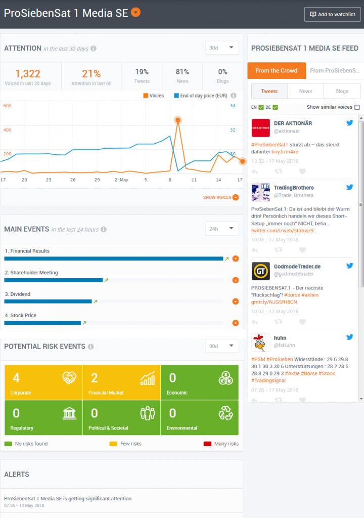 Die Grafik zeigt eine Analyse zur Aktie von ProSiebenSat.1 vom 17. Mai 2018, nachdem die Aktie einen deutlichen Kursverlust hinnehmen musste. (Quelle: www.sentifi.com)