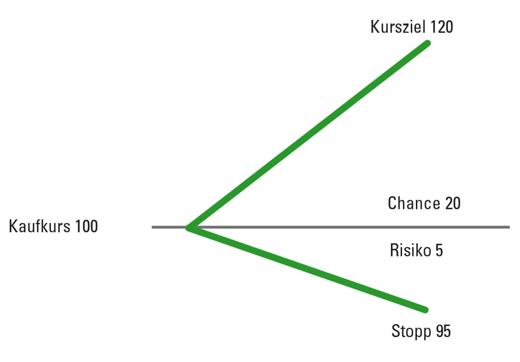 Ein Trader eröffnet eine Position bei 100 Euro und erwartet eine Bewegung nach oben bis 120. Zum Schutz setzt er einen Stopp bei 95. Das CRV ist somit 20 / 5 = 4:1. Quelle: www.traders-mag.com