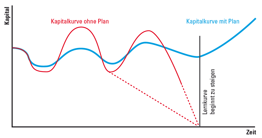 Bei Anfängern ist das Kapital häufig bereits weg, noch bevor der Zeitpunkt gekommen ist, an dem die Lernkurve und damit der Erfolg überhaupt steigen (senkrechte Linie). Sie beginnen mit wahllosen Trades (rote Linie), erwischen den einen oder anderen Glückstreffer und schwanken so immer zwischen Gewinn und Verlust. An den Hochpunkten kommen der Reiz und die Gier nach größeren Gewinnen und so wird die Positionsgröße oder der Hebel erhöht. Das führt im schlimmsten Fall zu noch größeren Verlusten und damit zum Ende des Kontos. Meist fängt erst dann die Lernkurve an zu steigen, wenn kein Kapital mehr zum Traden vorhanden ist. Anders könnte es mit einem konkreten Plan von Anfang an verlaufen (blaue Linie). Die Kapitalkurve würde über eine längere Zeit langsam ansteigen. Sobald die Lernkurve dann weit genug nach oben gelaufen ist, sind dank des vorhandenen Kapitals und des angesammelten Wissens gute Gewinne möglich. Quelle: www.traders-mag.com