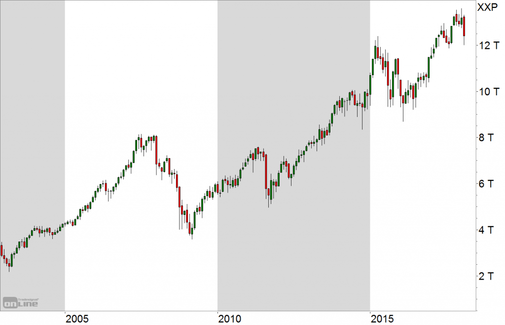 Eines hat die Vergangenheit gezeigt: Langfristig geht es bei Aktien im Durchschnitt nach oben. Natürlich gibt es immer wieder Krisen und sogar Crashs, die aber am Ende Kaufgelegenheiten darstellten. Der Chart zeigt exemplarisch die letzten 15 Jahre des DAX im Monats-Chart. Quelle: www.tradesignalonline.com