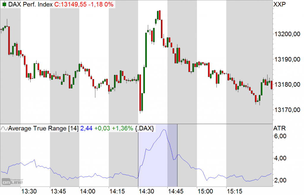 Am 08. Dezember 2017 wurden um 14:30 Uhr die vielbeachteten Nonfarm Payrolls (US-Arbeitsmarktbericht) veröffentlicht. Vor der Veröffentlichung war die Volatilität im DAX-1-Minuten-Chart recht niedrig, während sie zur Veröffentlichung stark anstieg. In diesem Fall waren es dabei nicht einmal exorbitant gute Zahlen, die den Markt hätten nachhaltig beeinflussen können. Quelle: www.tradesignalonline.com