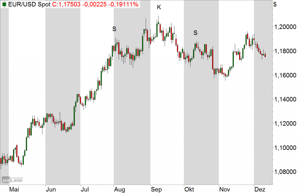 Auf Anfänger wirken Charts zunächst wie ein chaotisches Durcheinander. Er muss nun lernen, Verläufe und Muster bis zu einem gewissen Grad überlegungsfrei zu erkennen, das heißt, diese zu sehen, ohne erst danach suchen zu müssen (Bild 2). Das funktioniert im besten Fall ähnlich wie bei Buchstaben und Wörtern, die man auf einen Blick erkennt, ohne dabei noch aktiv nachdenken, entziffern oder decodieren zu müssen.
