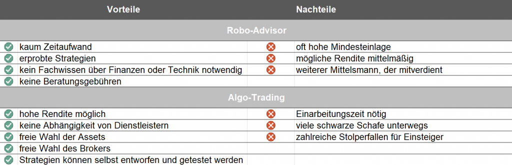 Die Tabelle zeigt die Vor- und Nachteile von Robo-Advisors und Algo-Trading auf einen Blick. Quelle: eigene Angaben des Autors