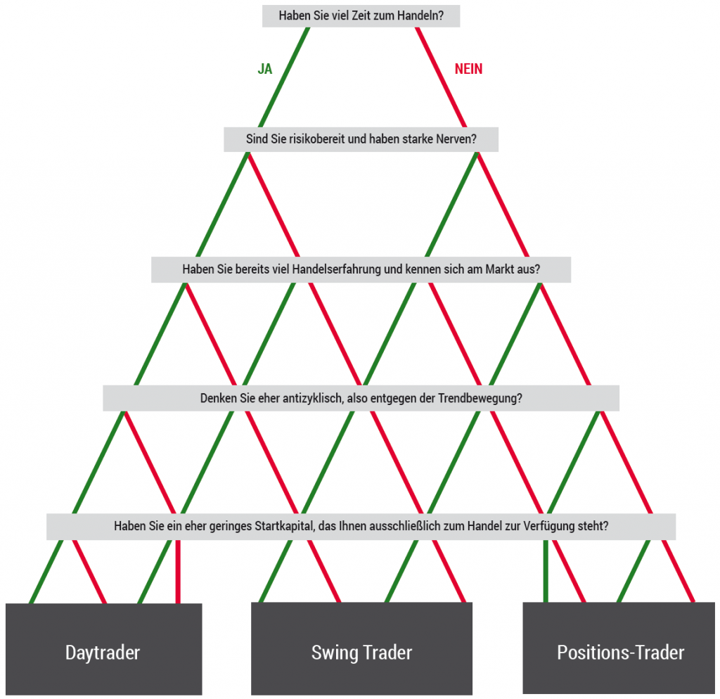 Bevor Sie sich intensiver dem Daytrading als Beruf widmen, sollten Sie sich sicher sein, dass dieser Stil auch zu Ihnen passt. Dafür haben wir einen Fragebaum erstellt, den Sie durchgehen können. Beginnen Sie von oben und beantworten Sie die erste Frage mit Ja (grüne Linie) oder Nein (rote Linie). Wichtig ist, dass Sie immer Ihrer jeweiligen Linie zur nächsten Frage folgen und diese beantworten. Am Schluss gelangen Sie zum passenden Trading-Stil.