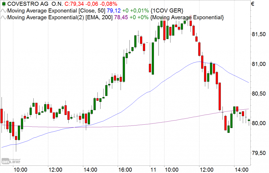 Bei der Covestro AG kreuzten sich Mitte April die beiden exponentiell gewichteten Gleitenden Durchschnitte (EMA). Dabei durchbrach der kurzfristigere über 50 Perioden den längerfristigen über 200 Perioden, was ein Kaufsignal darstellte. Bis zum Ende des Handelstages konnte man somit vom Kursanstieg profitieren.