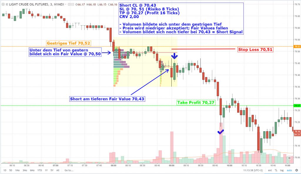 Institutionelle Händler benötigen Volumen, um große Positionen kostengünstig in den Markt zu bringen. Deshalb sind vor allem die Preisniveaus von Interesse, bei denen hohe Liquidität in Form von Kauf- oder Verkaufs-Limit-Orders zu erkennen oder bei denen Stopp-Orders zu erwarten sind.