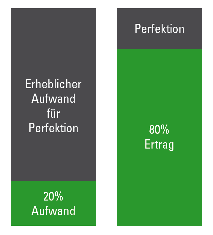 Die Grafik zeigt das klassische Verhältnis nach dem Pareto-Prinzip. Durch richtige Prioritätenverteilung lassen sich oft 80 Prozent der Ziele mit 20 Prozent Einsatz erreichen. Jede weitere Anstrengung für die restlichen 20 Prozent und damit das Erreichen von Perfektion stehen in signifikanter Unverhältnismäßigkeit.
