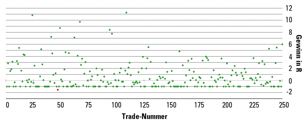 Diese Grafik stellt die Bedeutung der alten Börsenweisheit „Verluste begrenzen und Gewinne laufen lassen“ in ihrem Kern dar. Der X-Achse ist die Anzahl der Trades zu entnehmen. Die Y-Achse zeigt den risikofachen Gewinn beziehungsweise Verlust. Es ist gut zu erkennen, dass die Verlust-Trades bei einem vordefinierten Risiko ausgestoppt wurden, die Gewinne dagegen die Möglichkeit der Entfaltung bis zum Zwölffachen hatten.